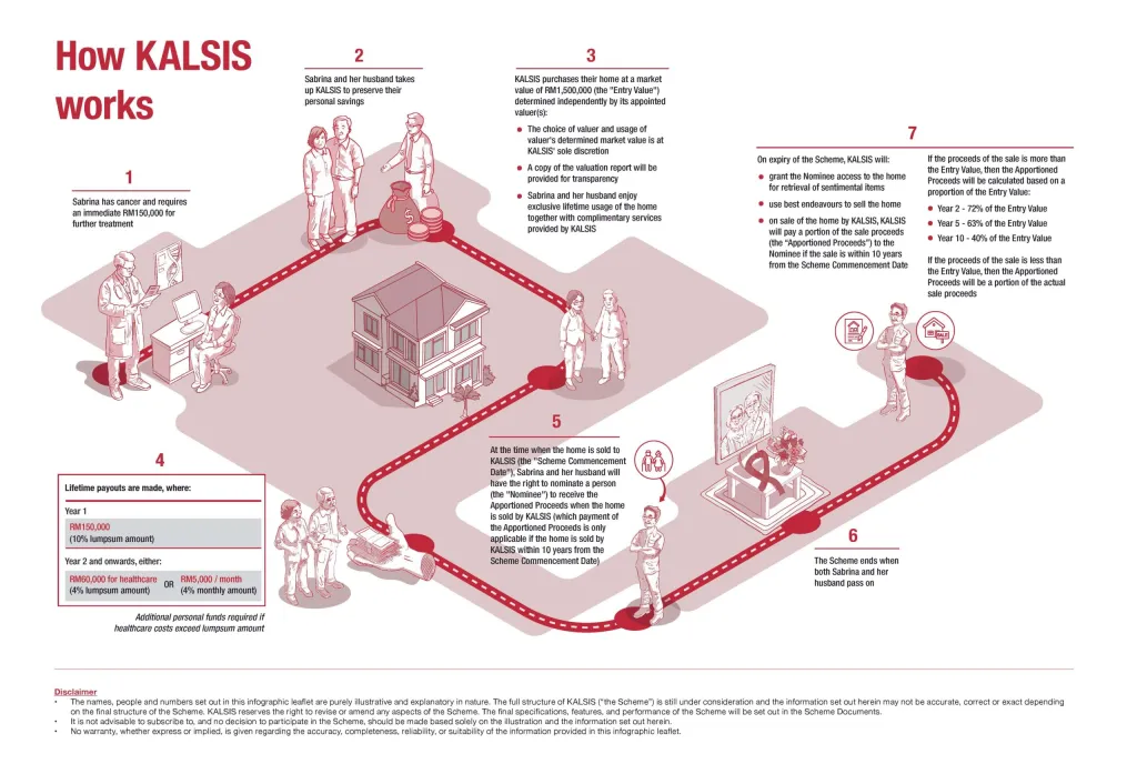 Under KALSIS, Malaysian seniors in the Klang Valley with cancer can sell their house to the scheme to fund their treatment, while continuing to live in that property for life. They get lump sum payments for health care, plus monthly payments until their passing.